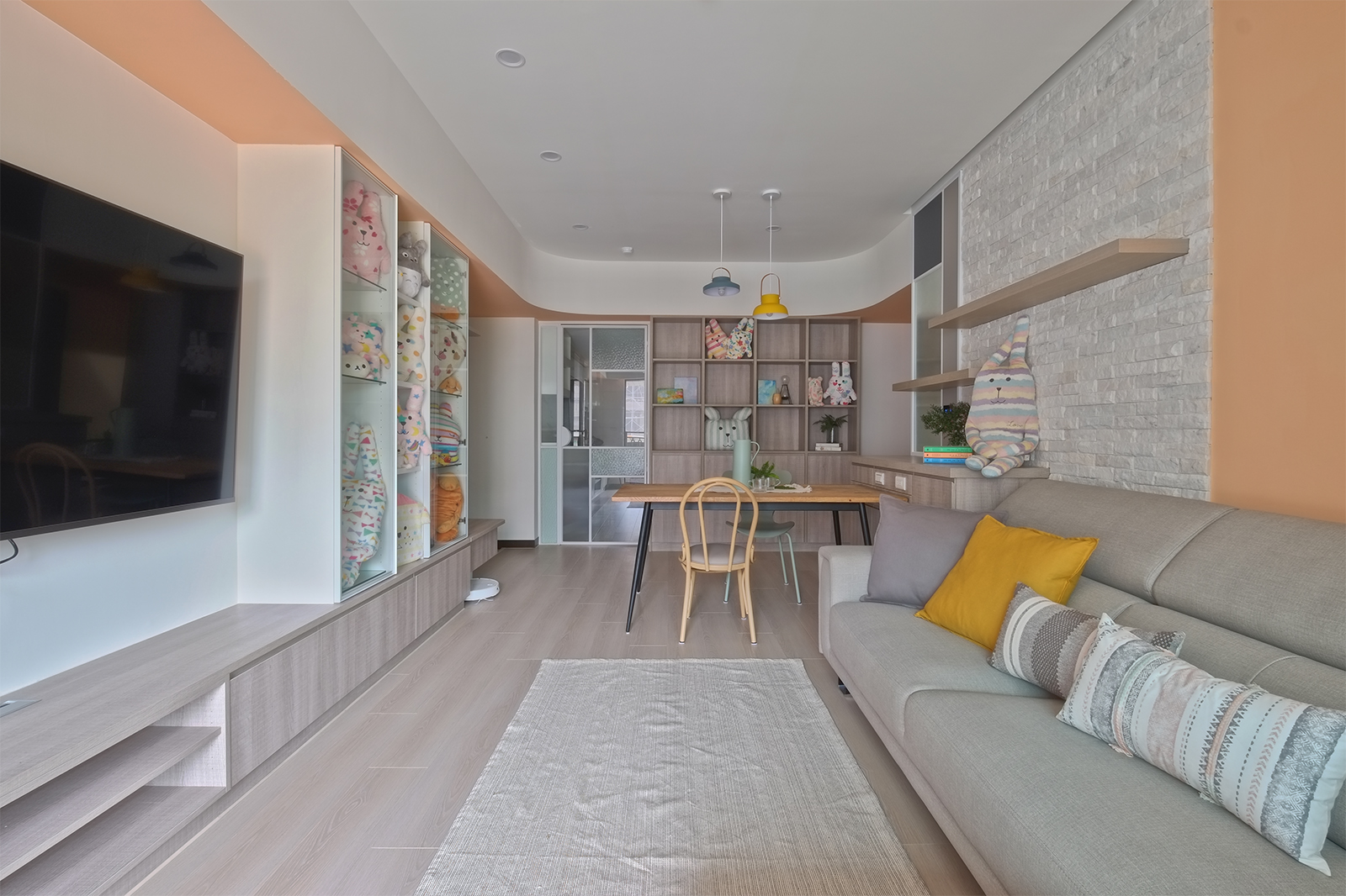 鮮亮的色彩和玩偶展示,為回家創造了一種轉換心情的氛圍。讓屋主能夠在醫護工作結束後,回到舒適的小天地中,卸下情緒的緊繃。這樣的環境不僅提升了居家氣氛,還能夠幫助放鬆心情,享受私人空間的自在感。玩偶的展示更增添了家中的趣味與活力,使得每次開門的瞬間都成了一種心情的轉換。