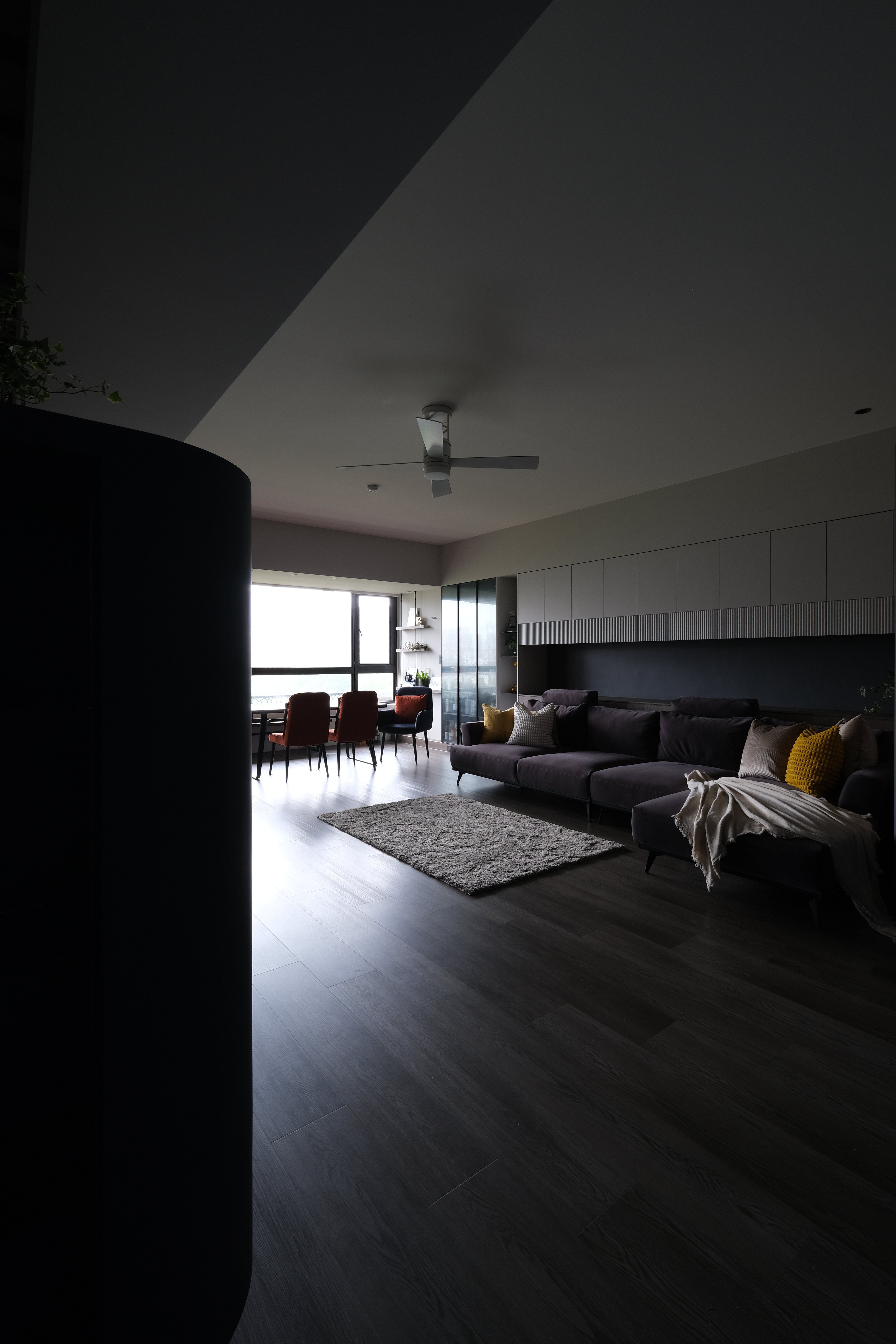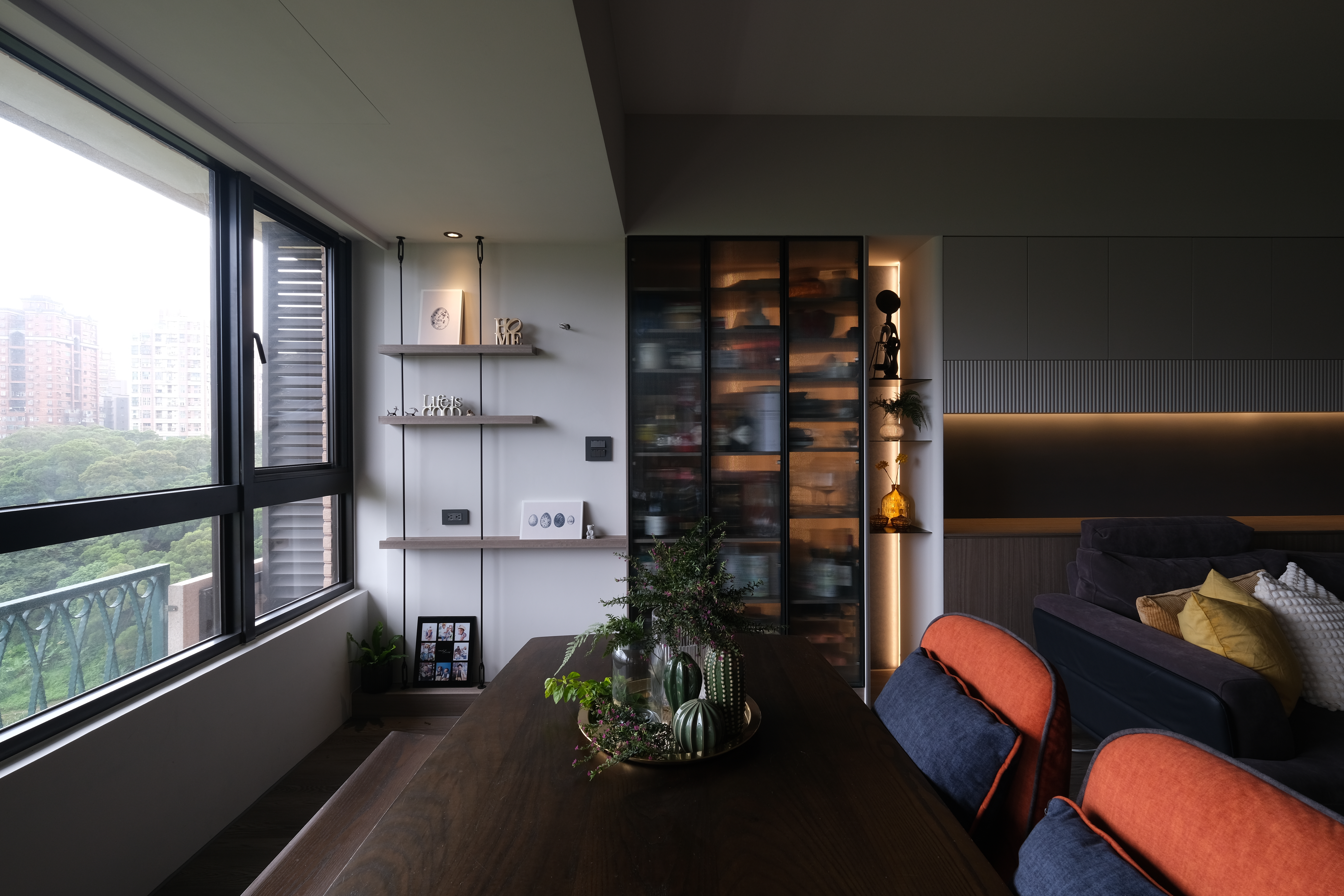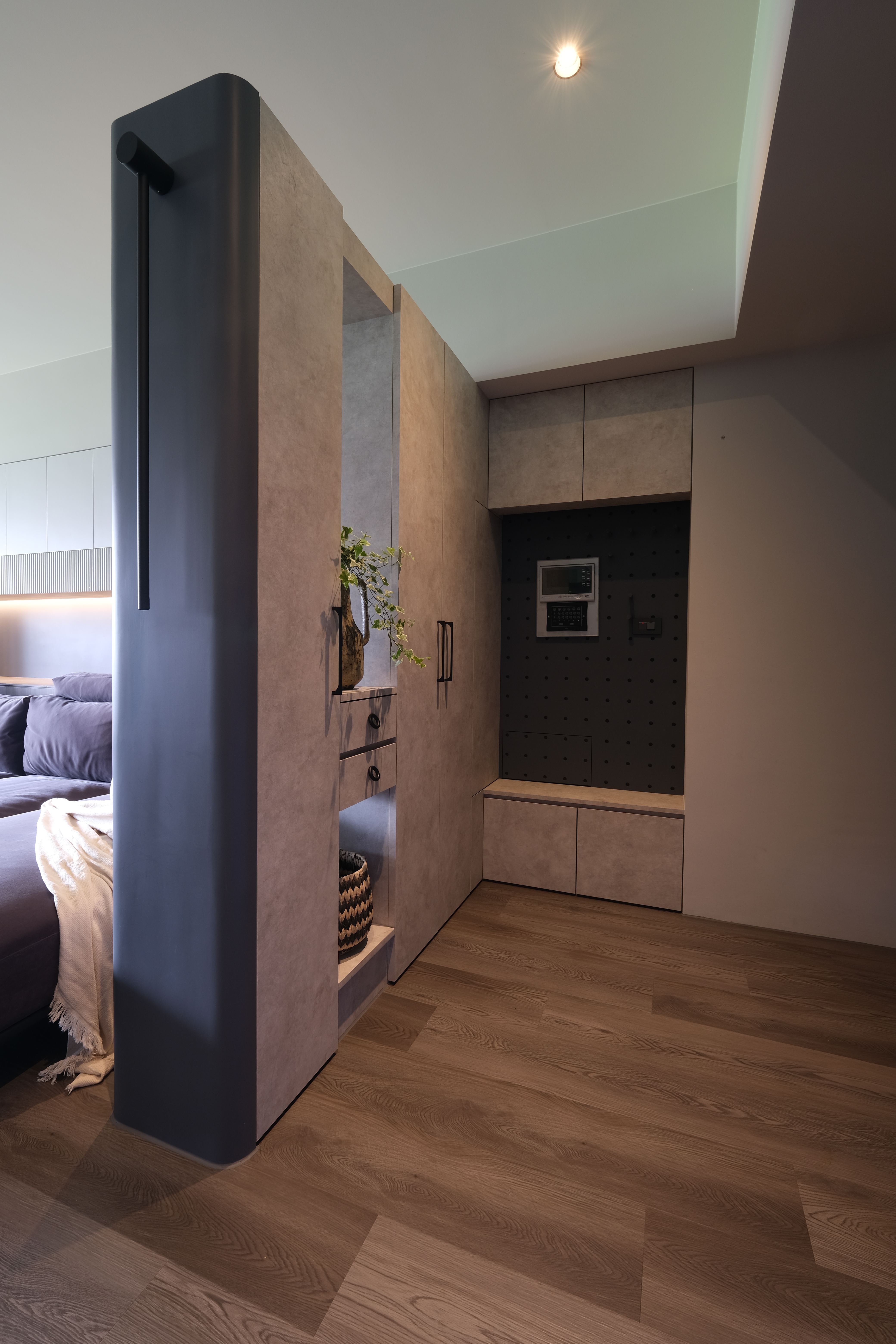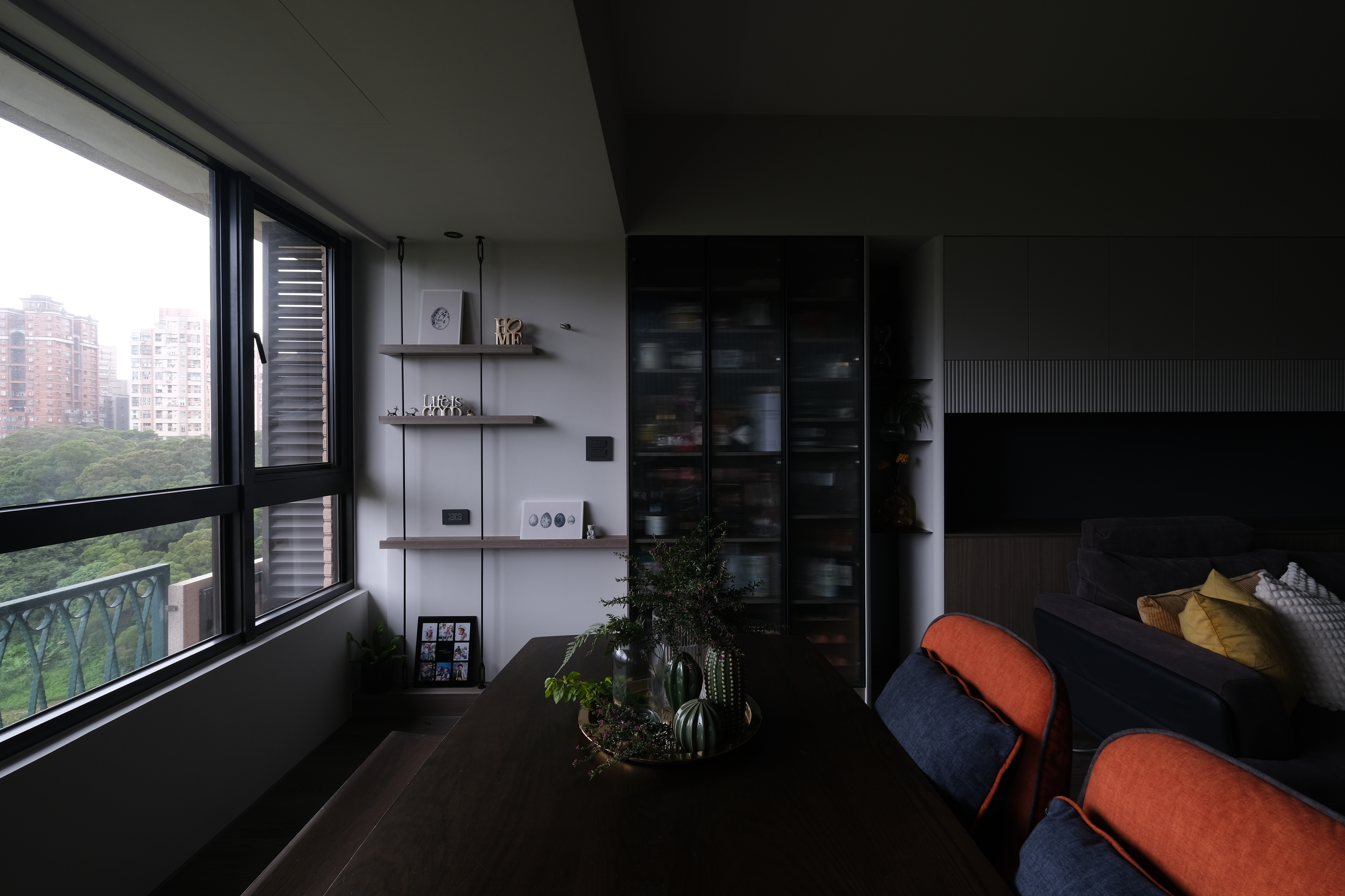 兩個男孩的男生宿舍,物品永遠是必要的雜繁。希望在空間中,能輕鬆交流並各自安好,緊密又獨立的個體與親子關係。我們大膽的在空間中央起個四方島,創造四個面向的機能,阻斷視覺的干擾,讓剩下的四感好好協作。機能區的並排與串聯,生活繞著島迴動,進行各種例行日常,一起看電影打電動,孩子寫作業,聽音樂弄花草。