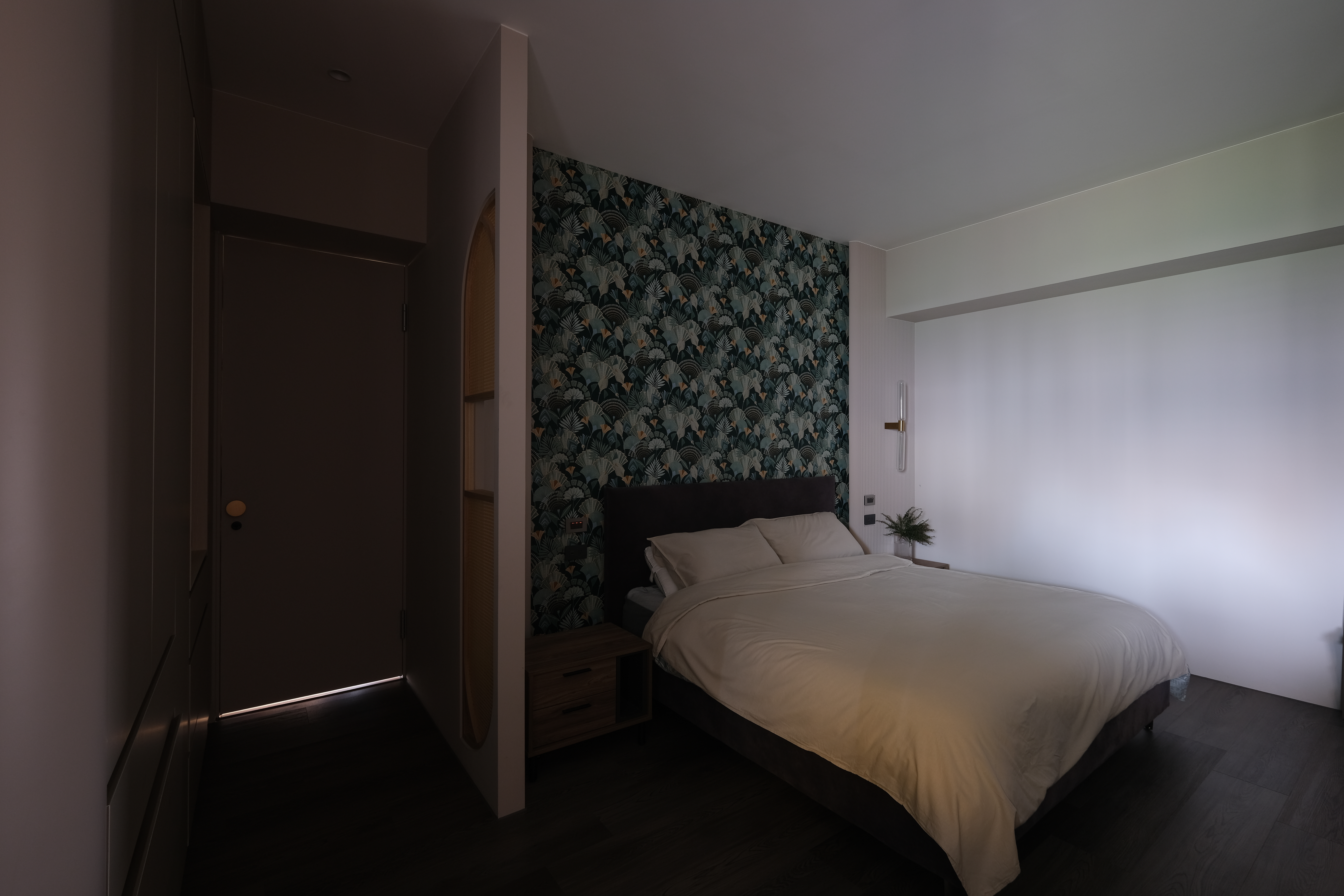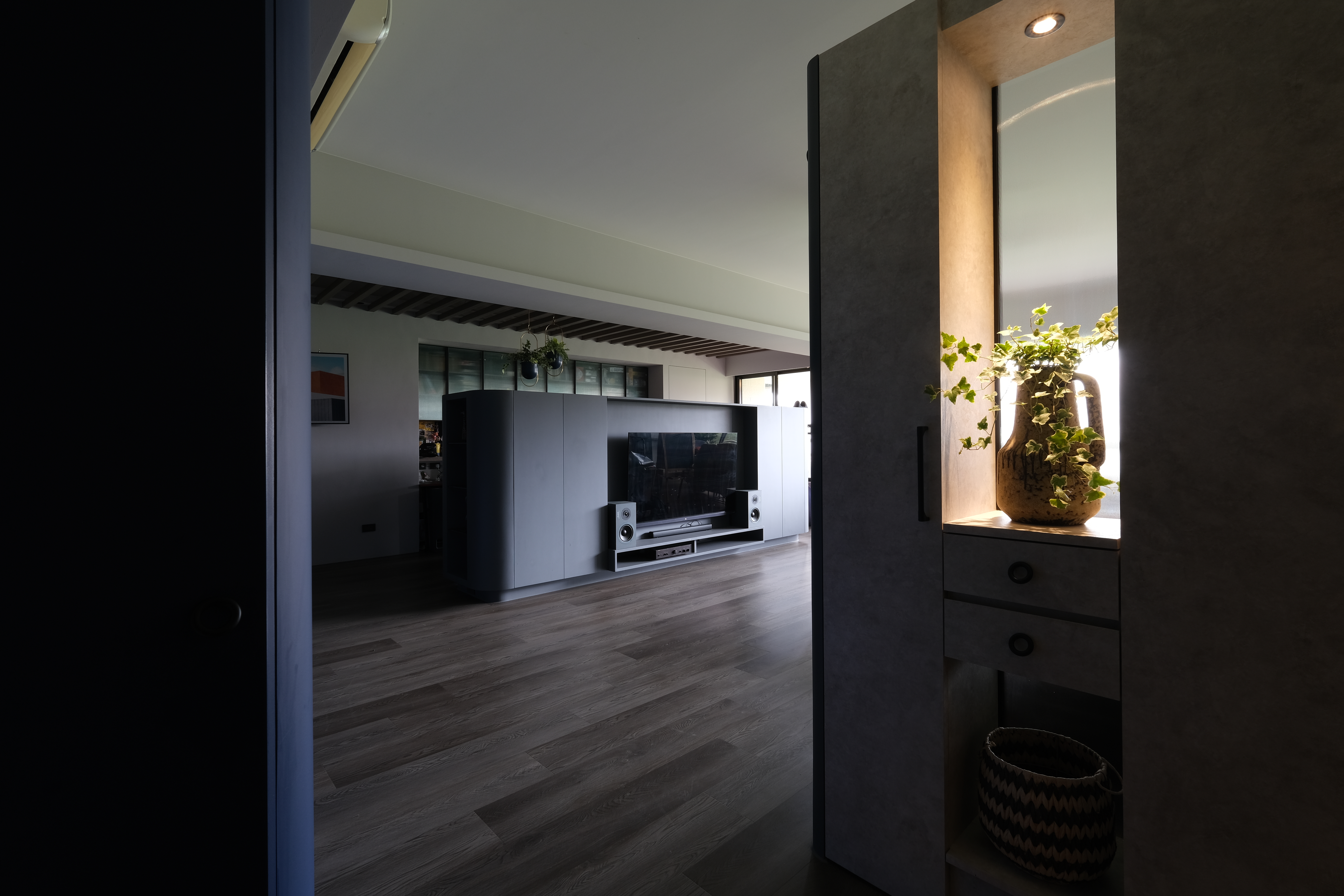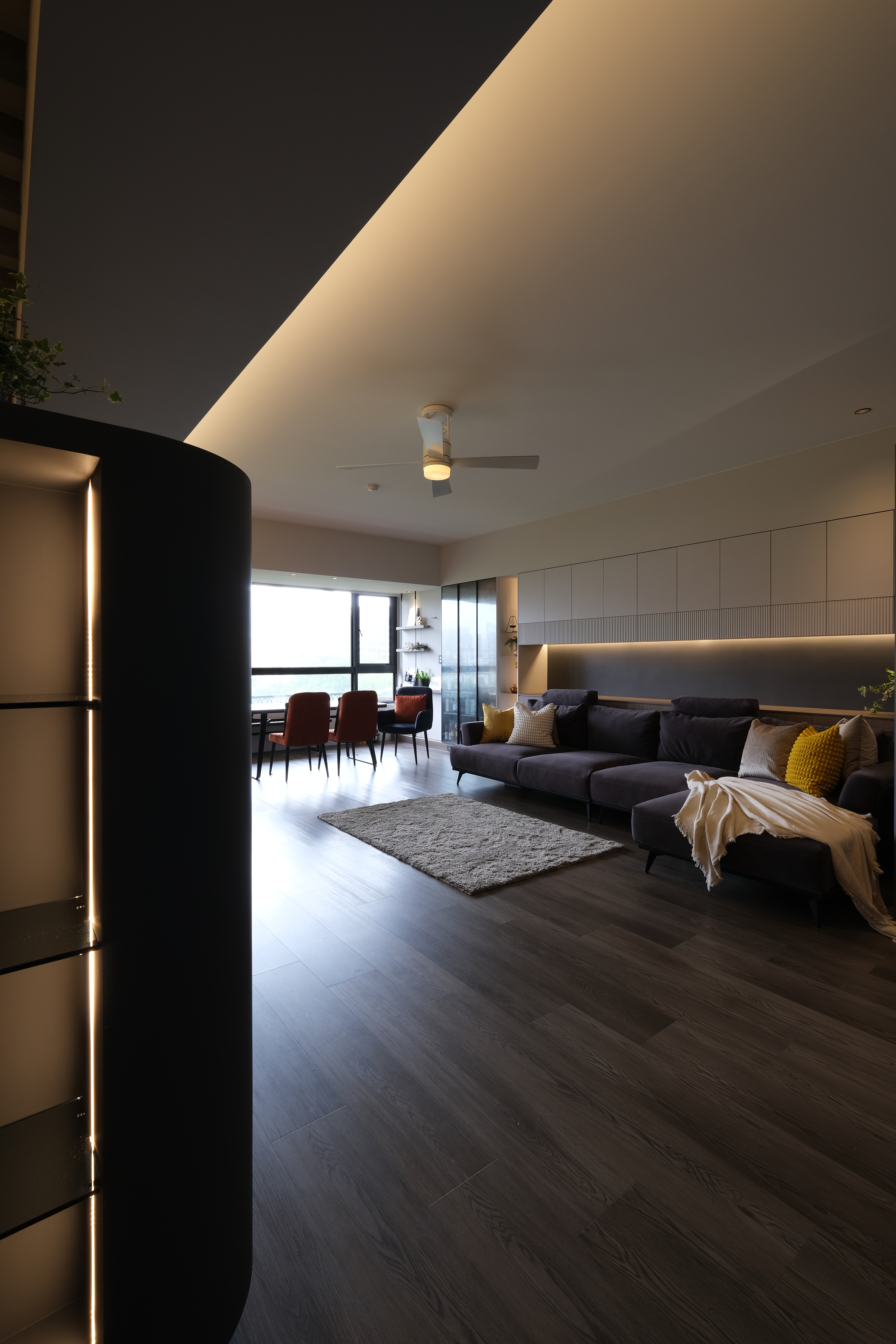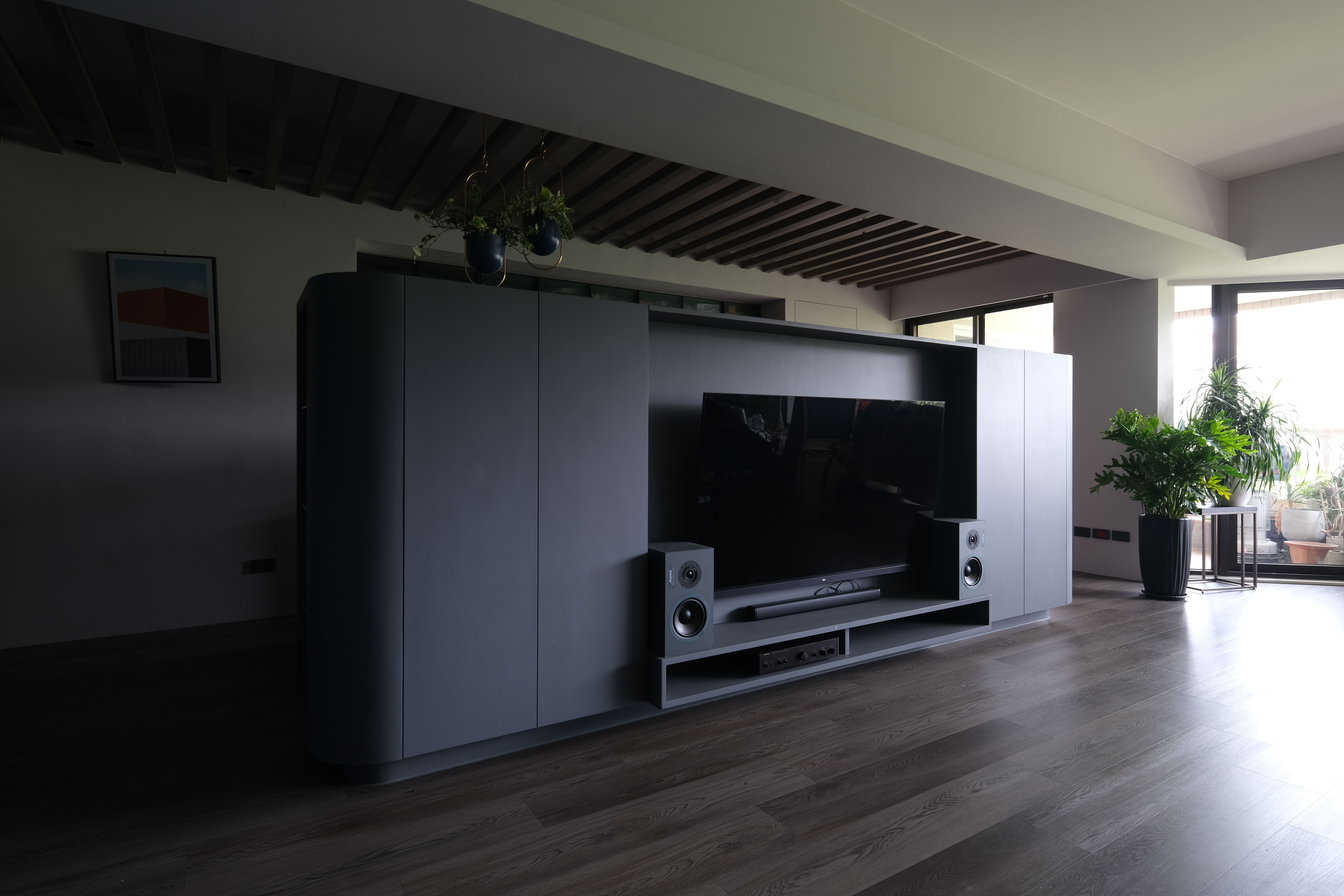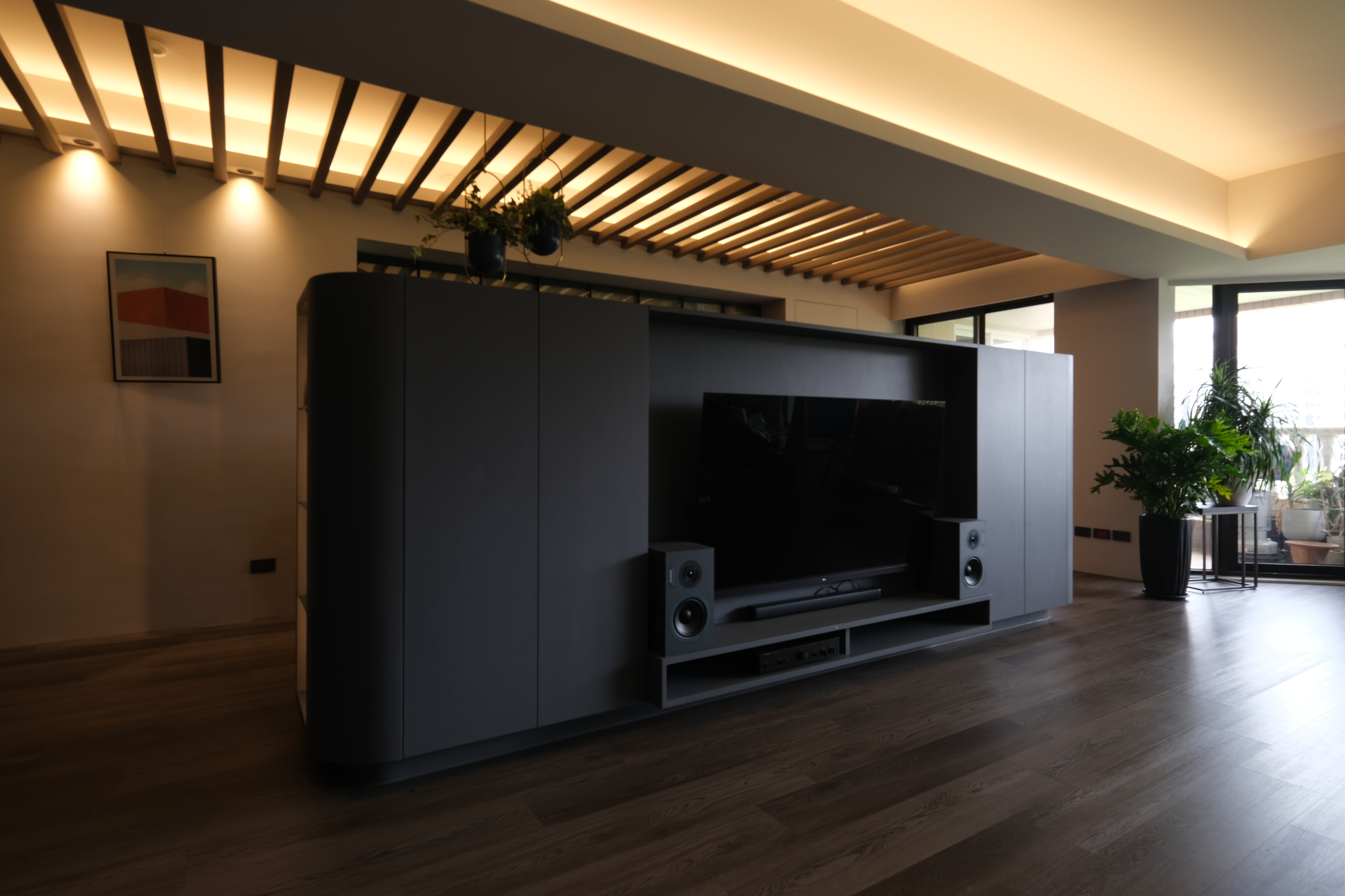 兩個男孩的男生宿舍,物品永遠是必要的雜繁。希望在空間中,能輕鬆交流並各自安好,緊密又獨立的個體與親子關係。我們大膽的在空間中央起個四方島,創造四個面向的機能,阻斷視覺的干擾,讓剩下的四感好好協作。機能區的並排與串聯,生活繞著島迴動,進行各種例行日常,一起看電影打電動,孩子寫作業,聽音樂弄花草。